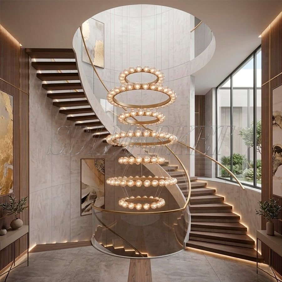 Многоярусная люстра из коллекции Bubbles (артикул MC0120-004) — это воплощение современной роскоши и геометрического совершенства, созданное для интерьеров, претендующих на эксклюзивность. Конструкция модели, состоящая из нескольких ярусов колец с декором из гальванизированного стекла, эффектно сочетается с каркасом из алюминия в благородном цвете «матовое золото шампань». Теплый свет с цветовой температурой 3000 К в сочетании с высоким индексом цветопередачи (CRI ≥ 90) наполняет пространство мягким и естественным сиянием, подчеркивая глубину текстур и делая эту люстру идеальным центральным элементом для просторных гостиных, холлов или столовых зон, где важна не только освещенность, но и визуальный статус.