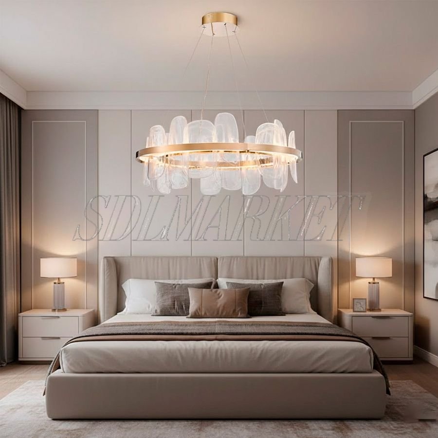 Подвесная люстра MC0190-002 — это воплощение элегантного контраста, давшего название коллекции Ice and Fire («Лед и Пламя»). Средний формат в линейке (диаметр 880 мм) делает её универсальным решением для помещений площадью до 20 м². Основание выполнено из высококачественной нержавеющей стали с гальваническим покрытием в оттенке «зеркальное золото цвета шампанского». Декоративные элементы из белого нефритового стекла ручной работы мягко рассеивают свет, имитируя тающий лед, сквозь который пробивается теплое «пламя» светодиодов.
