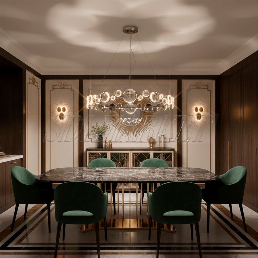 Воплощение истинного аристократизма и блеска эпохи джаза — люстра из эксклюзивной коллекции K9 Diamond. Модель в стиле Art Deco представляет собой величественное кольцо диаметром 1000 мм, инкрустированное кристаллами премиального хрусталя K9 с ювелирной огранкой. Основание из зеркальной нержавеющей стали, созданное методом многослойной электрогальваники, идеально отражает свет, создавая магическую игру бликов. Теплое свечение 3000K в сочетании с эталонной цветопередачей CRI ≥ 90 наполняет пространство уютным, но торжественным сиянием, превращая интерьер в сцену из «Великого Гэтсби»